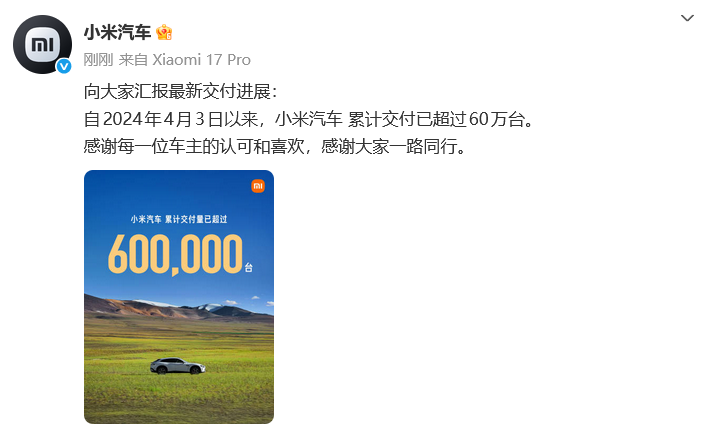 2月13日,@小米汽车 发文公布最新交付进展:自2024年4月3日以来,小米汽车累计交付已超过60万台。感谢每一位车主的认可和喜欢,感谢大家一路同行。