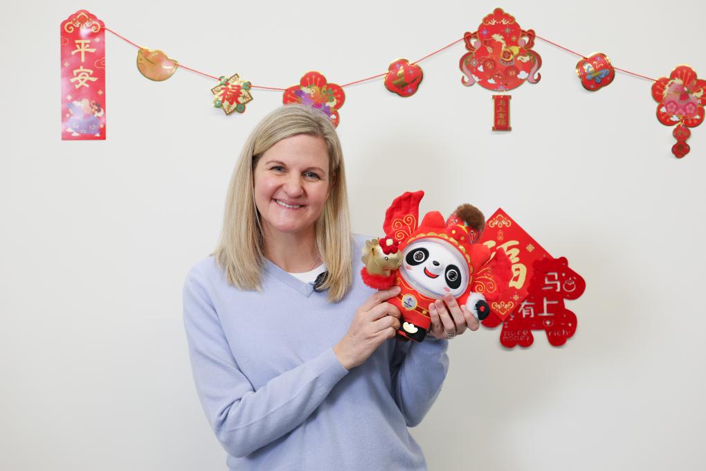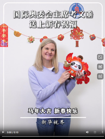 2026年2月13日,国际奥委会主席考文垂在新华社米兰冬奥会报道中心展示“马墩墩”。新华社记者张铖摄