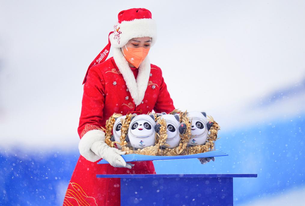 2022年2月12日,北京冬奥会纪念品颁发仪式工作人员摆放“冰墩墩”纪念品。新华社记者许畅摄