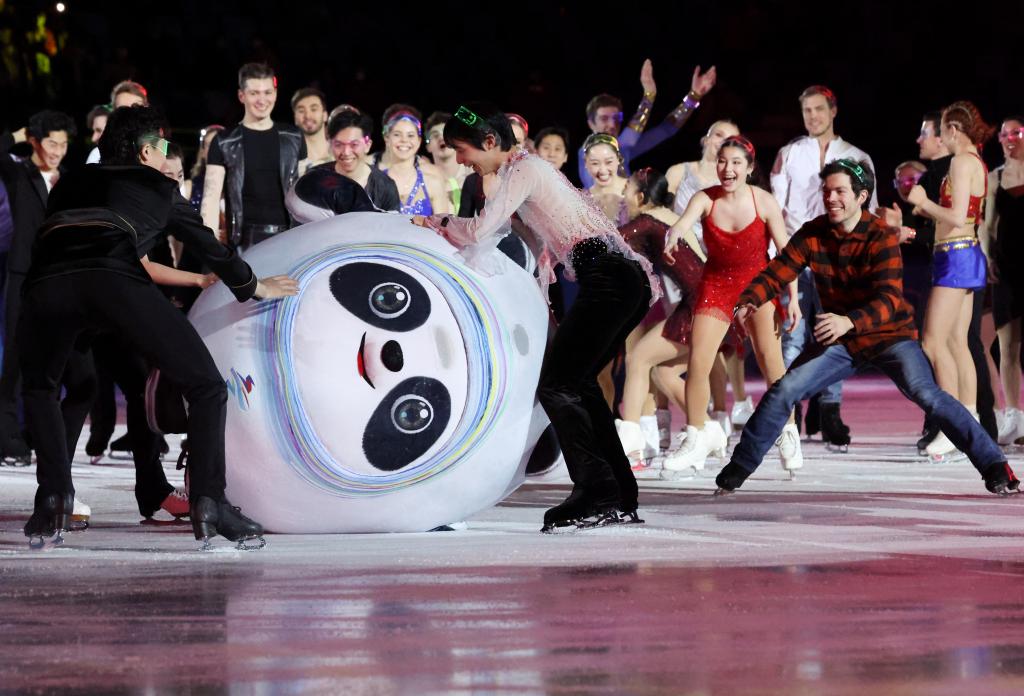 2022年2月20日,北京冬奥会花样滑冰表演滑举行,“冰墩墩”不小心摔倒后,选手们纷纷上前帮忙。新华社记者张玉薇摄