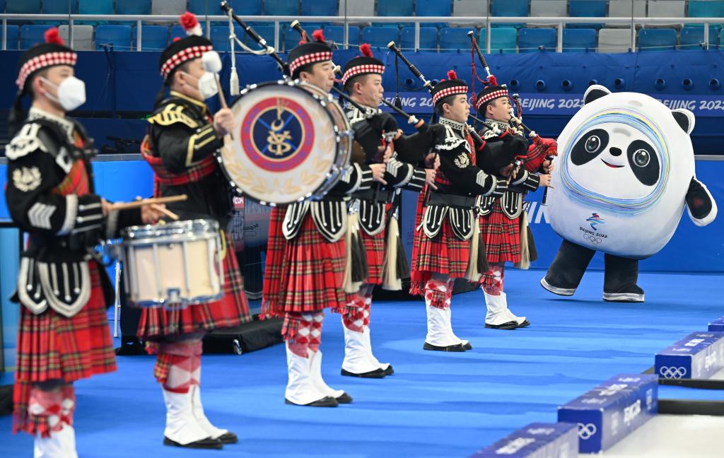 2022年2月19日,“冰墩墩”在北京冬奥会男子冰壶金牌赛开赛前热场助兴。新华社记者李贺摄