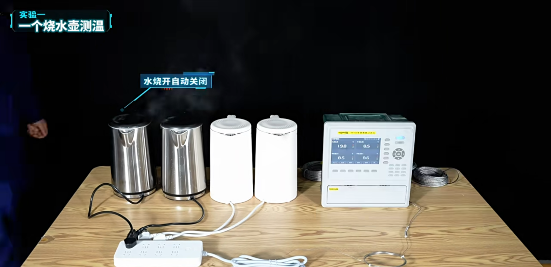 消防员将1台1800瓦的电热水壶插在国标插线板上,并将电线用捆扎带绑在一起。电热水壶开始工作后,用测温仪实时监测插线板电线的温度。当电热水壶烧开水自动断电时,此时测温仪显示,电线温度上升至19.8℃。