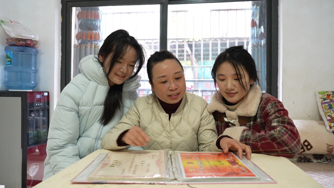 段相荣带孩子看奖状册