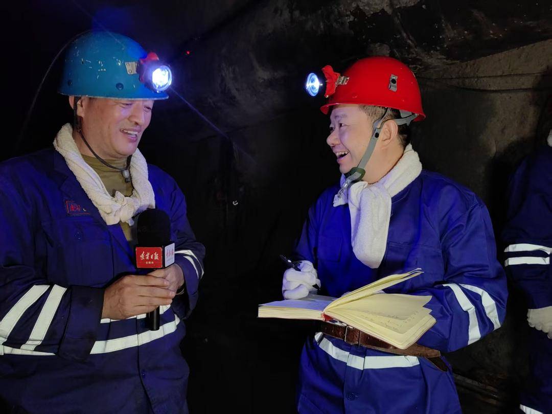 本报记者张小龙(右)在井下680米采访老虎台矿掘修区矿工郝立钢。