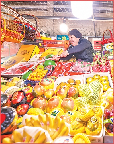 北京三源里市场,一位摊主在整理新鲜水果。
