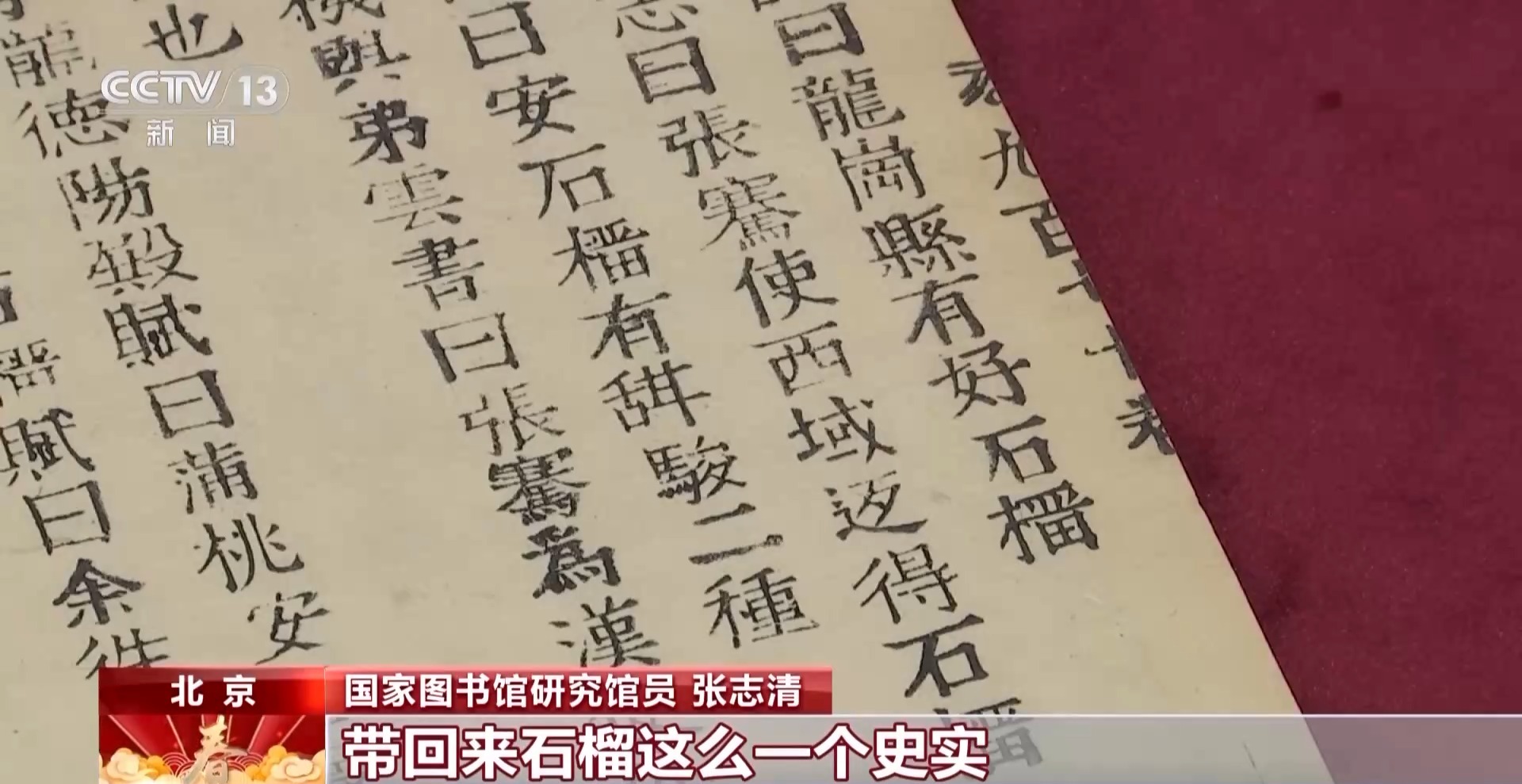 国家图书馆研究馆员 张志清:这个是宋代的四大书之一,叫《太平御览》。按现在说是百科全书,过去是按照类编的,所以叫类书。书中博物志曰张骞使西域返得石榴,《博物志》是西晋张华写的,这个太关键了。在这个里边还有一条,西晋陆机给陆云的信,在这个里面都有记载,张骞那个时候出使西域,带回来石榴这么一个史实。