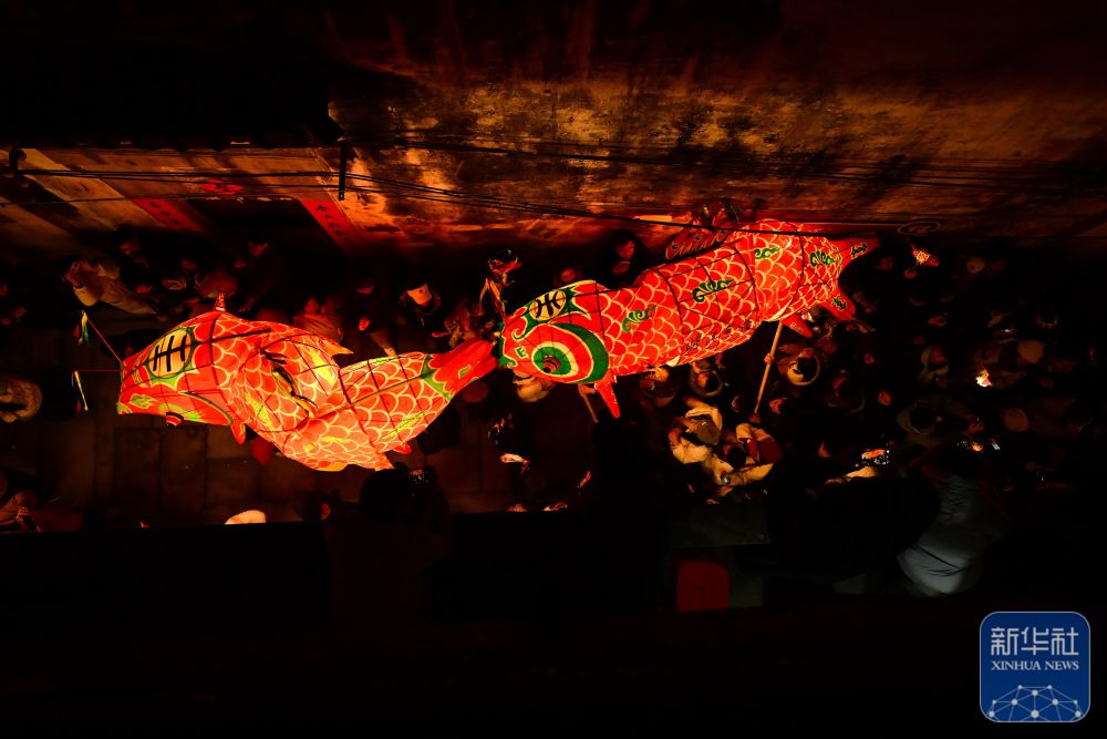 2月7日,瞻淇村鱼灯队在村中表演(无人机照片)。
