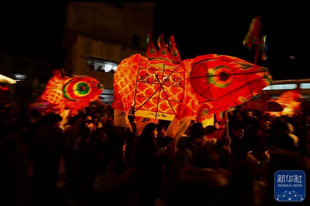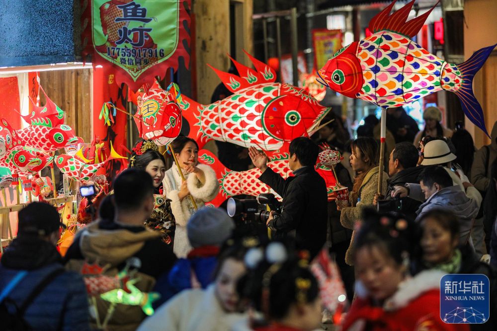 2月7日,游客在瞻淇村里体验鱼灯表演。