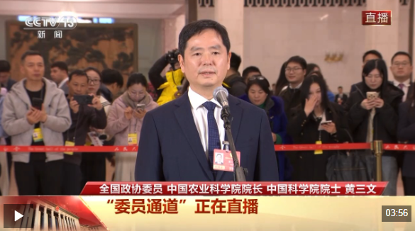 今天(3月4日)下午,全国政协十四届四次会议首场“委员通道”在人民大会堂举行,全国政协委员、中国农业科学院院长、中国科学院院士黄三文接受了总台记者采访。