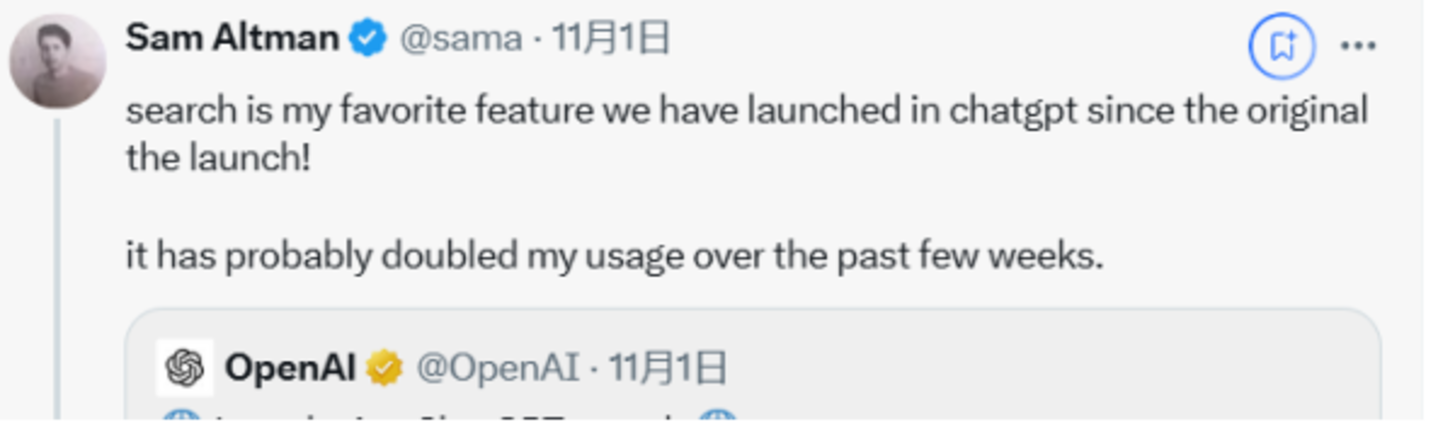 OpenAI的CEO山姆·奥特曼(Sam Altman)大赞这个新功能:“这是自ChatGPT本体发布之后,我最喜欢的一个功能!在过去几周我使用ChatGPT的次数可能都翻倍了。”
