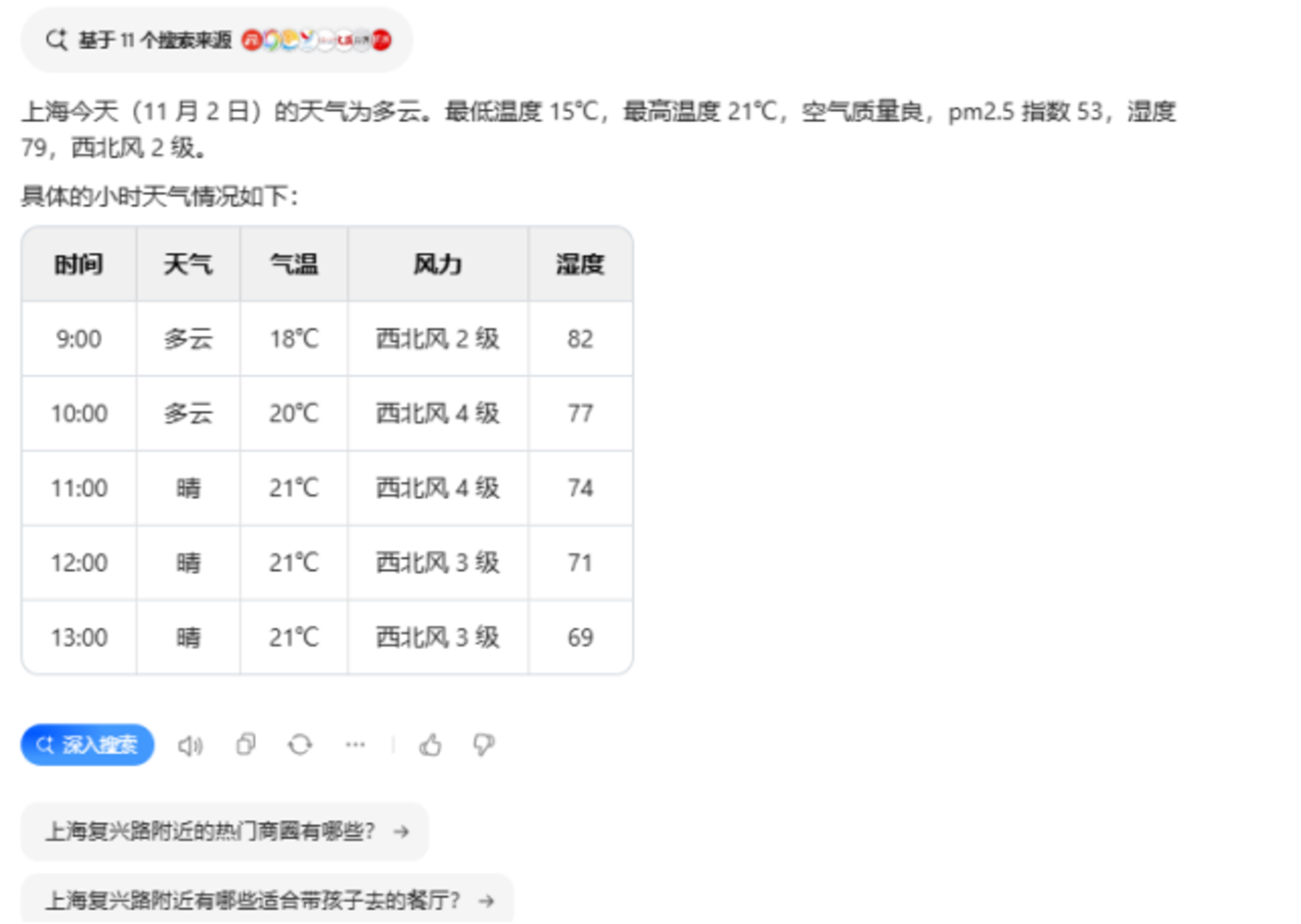 当询问“今天的天气”时,也会看到AI整合的一个小面板,天气信息一目了然,只不过缺少ChatGPT那种视觉设计。