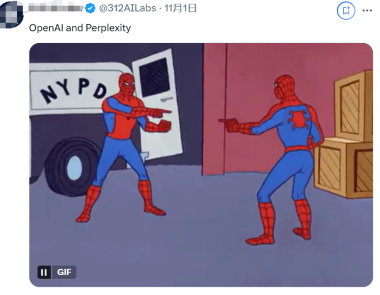 更有人贴脸开大,在OpenAI在X官宣的评论区贴上梗图:两个一模一样的蜘蛛侠互相指指点点(这个梗图在扎克伯格上线X对标产品Thread的时候也被拿来整过活)。