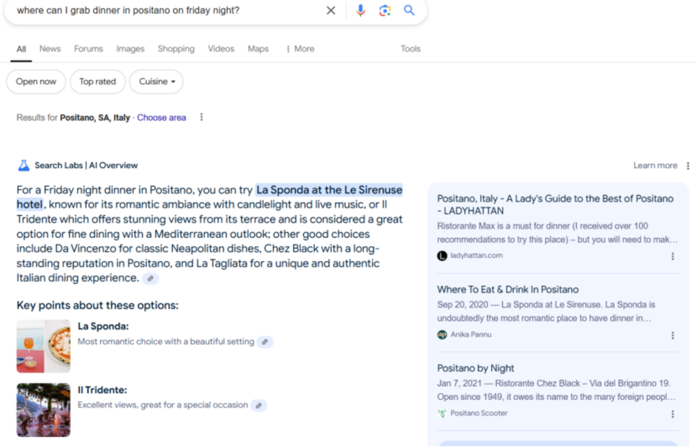 以搜索巨头谷歌为例。如今在谷歌搜索,会先显示AI摘要。我们用OpenAI此次放出的演示中相同的问题:“我周五晚上在波西塔诺,在哪里可以吃个晚餐?”进入谷歌搜索,AI摘要和ChatGPT搜索一样给出了图文结合的回答,并包含信源。