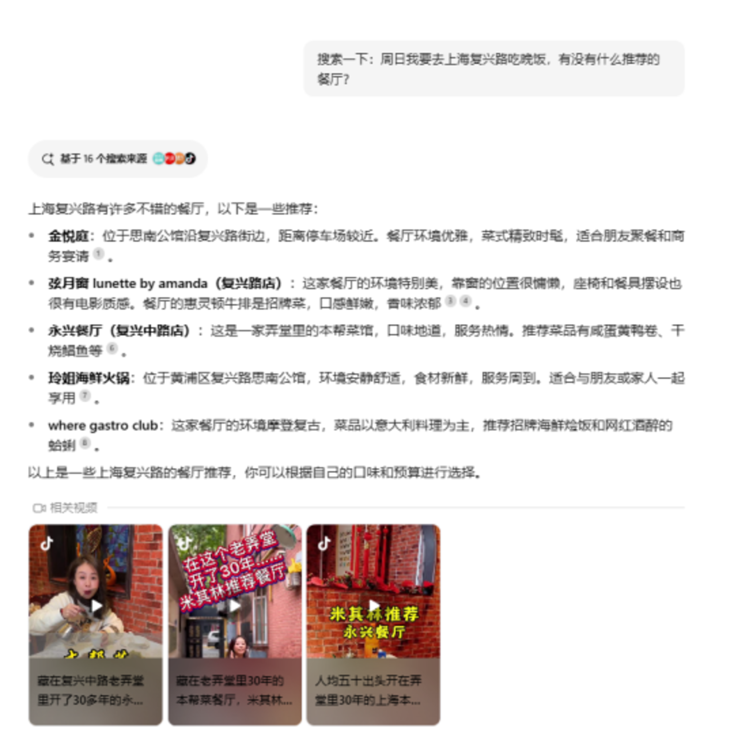 以字节的AI产品“豆包”为例。在豆包网页版登录,可以看到有“AI搜索”入口。此时如果也搜索餐厅推荐的问题如“这周日想去上海复兴路吃饭,有没有什么推荐”,豆包会以自然语言总结几家餐厅告诉用户,并且给出了信息来源,可点击跳转。此外,虽然没有附上图片,但附上了一些探店短视频供参考。