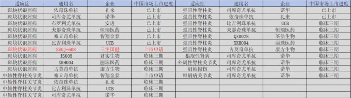 最典型的莫过于抗IL-17A靶点的608。今年8月三生国健宣布,608治疗成人中重度斑块状银屑病的关键注册性Ⅲ期临床研究成功,并即将递交上市申请。