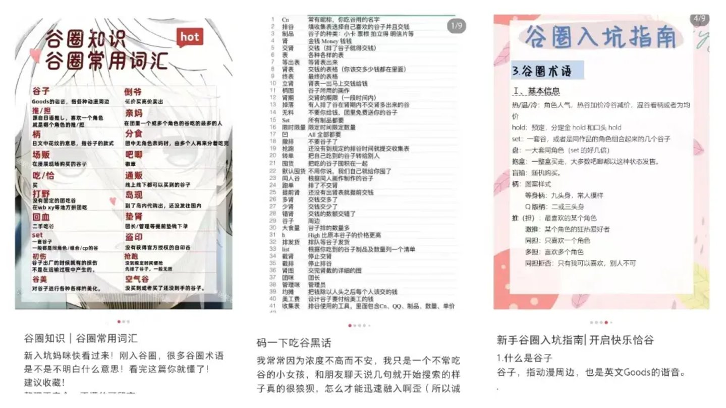 除了以上,还有一些实用周边,如睡衣、帽子、扇子等,类型非常丰富。围绕谷子,谷圈诞生了大量的专门词汇,这些谷圈“黑话”,让不少圈外人士望而却步。社交平台上甚至有不少网友晒出“吃谷黑话”集合表,便于人更快地融入谷圈。