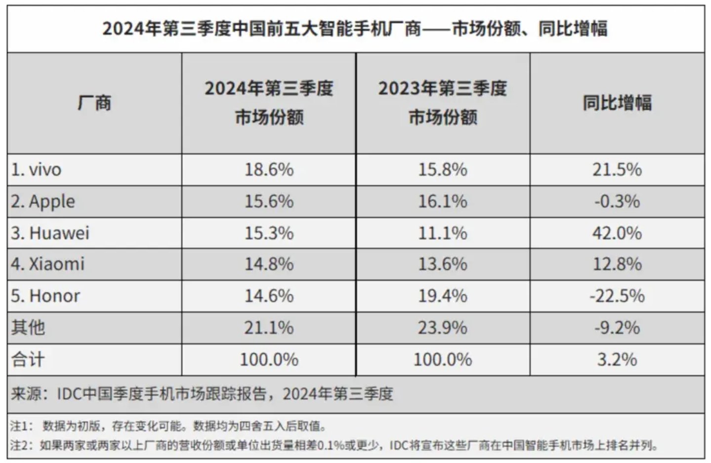 vivo、OPPO、小米、iQOO、荣耀、一加等手机品牌接连发布新品,并在影像、屏幕、性能上继续升级。而苹果2024财年第四财季(即截至9月28日的第三季度)财报显示,苹果大中华区市场营收已经连续五个季度同比下滑。根据IDC的数据,今年第三季度,苹果在中国市场的份额为15.6%,较去年同期的16.1%有所下降。