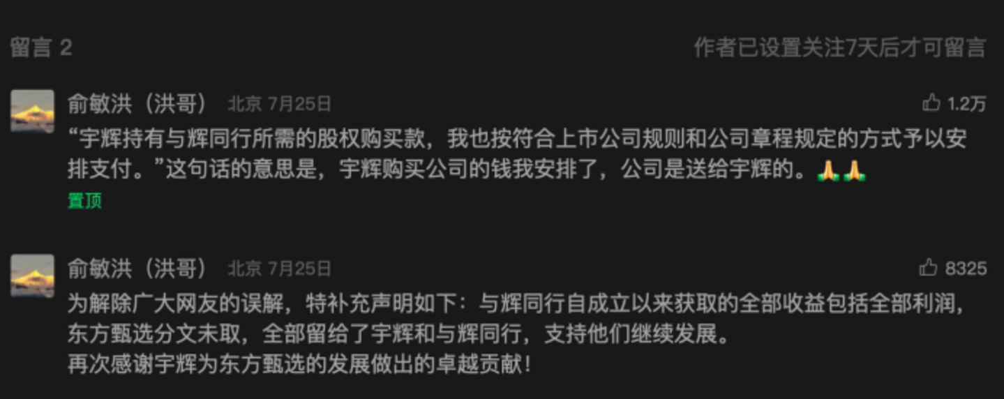 或许是为了避免纷争,当晚俞敏洪在个人公众号上用通俗的语言对此进行了回应与说明,并在文章下补充了两条评论: