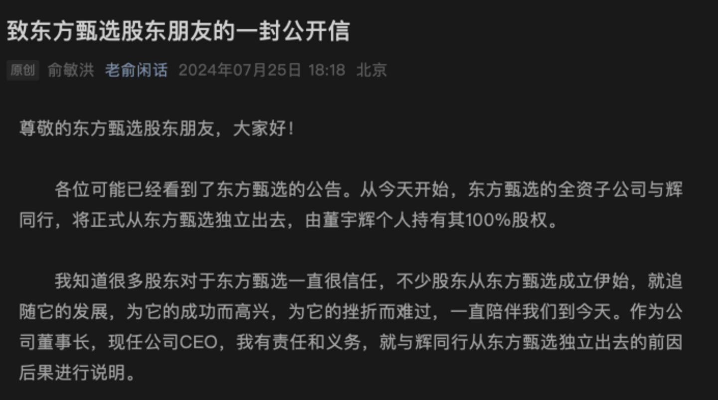 2024年7月25日晚,东方甄选在港交所发布公告,称董宇辉已决定不再担任公司雇员及公司一个合并联属实体的高级管理层,当日生效。
