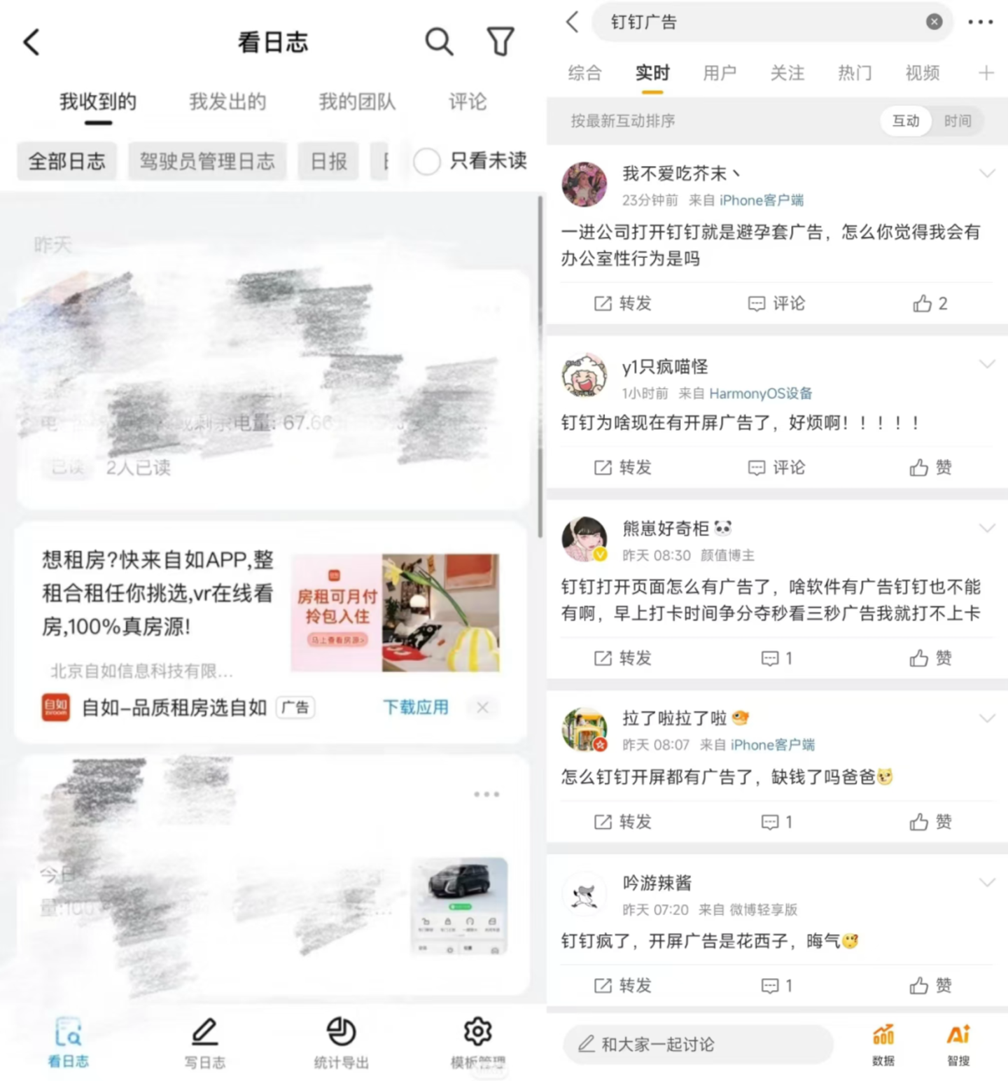 这些广告散布在钉钉的各个功能环节,除了饱受诟病的开屏广告外,钉钉直播回放和日志中的广告更是令用户难以接受。