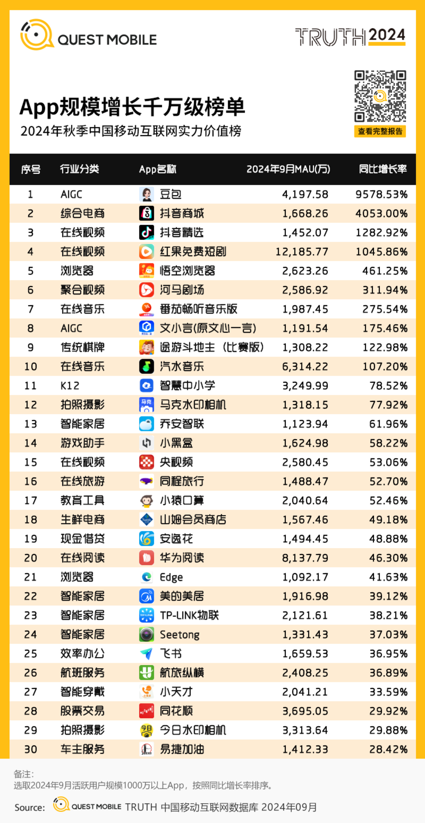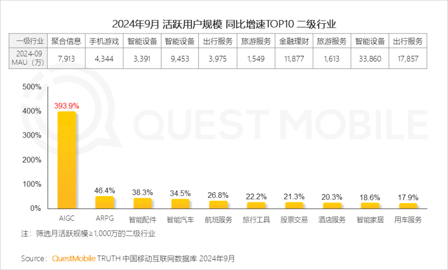 QuestMobile数据显示,2024年9月,AI原生应用行业规模同比增长393.9%,在规模千万级的行业中位列TOP1;增速TOP2行业为ARPG(手机游戏下属行业),同比增速46.4%。