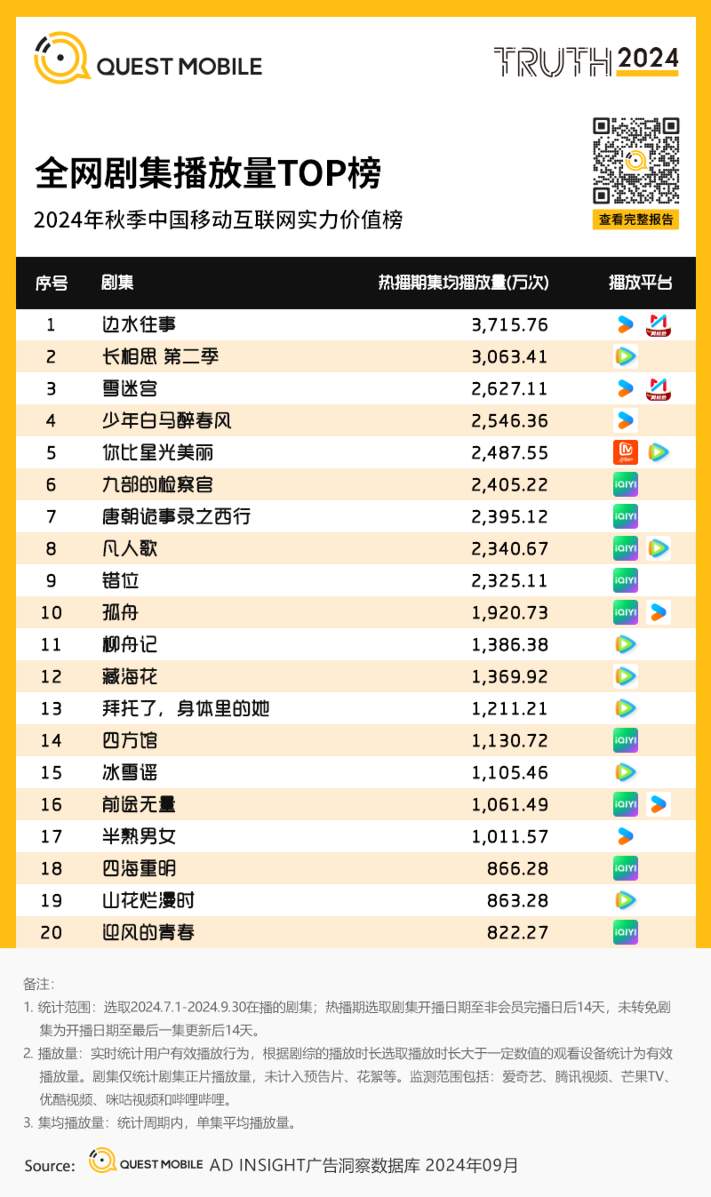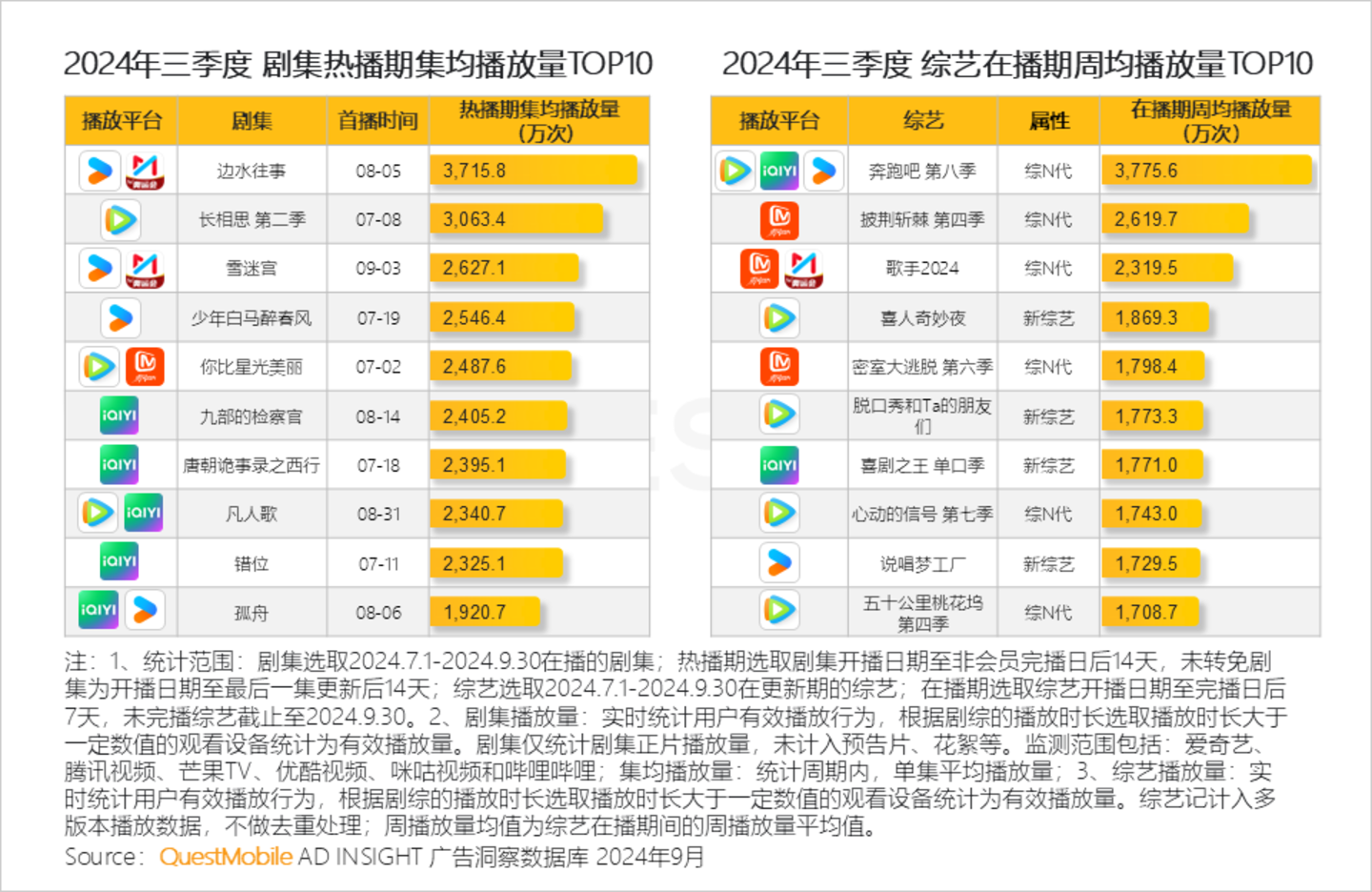 Ⅲ. 2024年三季度热播剧集类型多样,集均TOP10基本都在2000万次以上播放量;热门综艺以综N代为主的同时,多个喜剧、说唱新综艺的推出成为暑期新亮点