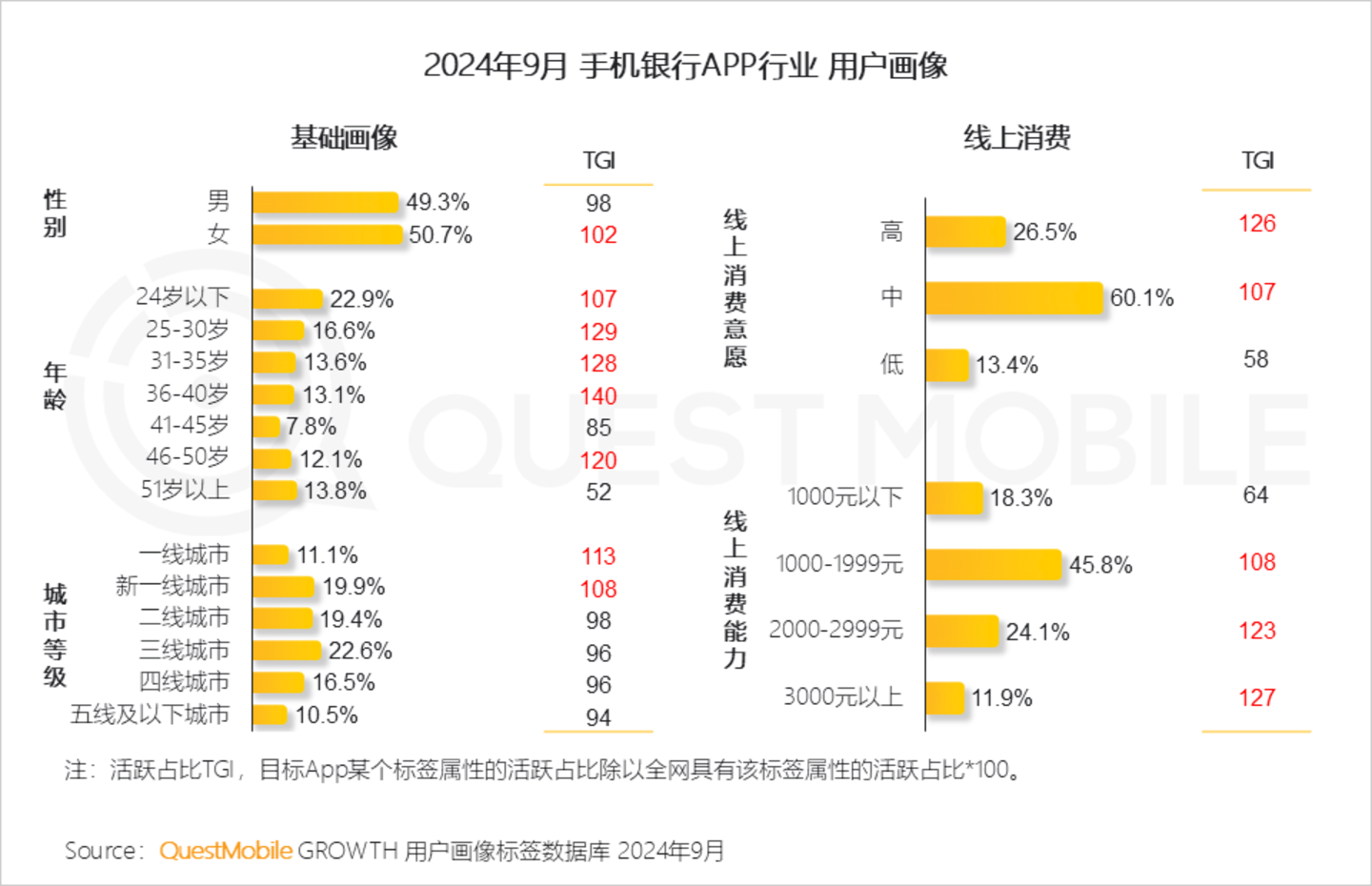 Ⅲ. 画像方面,手机银行APP用户男女分布均衡,40岁以下用户占比超60%,多数身处三线及以上城市,用户普遍具有中高线上消费意愿及较高线上消费能力