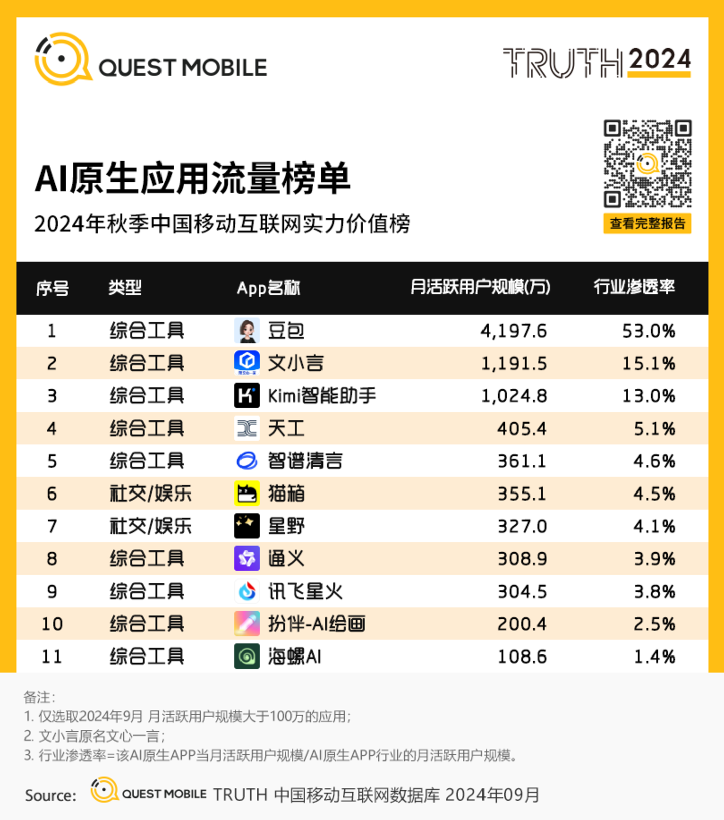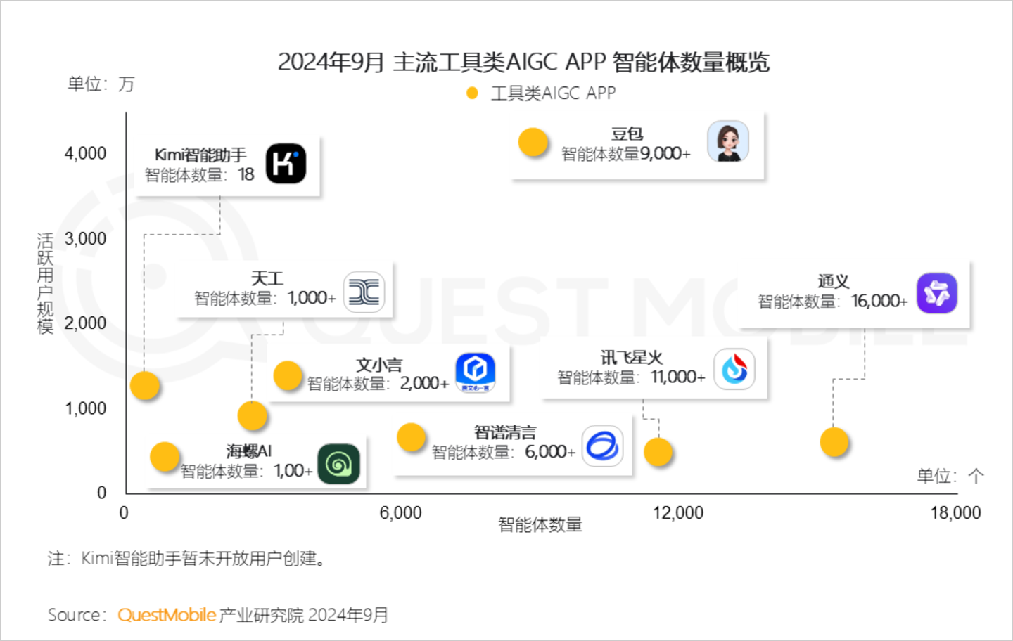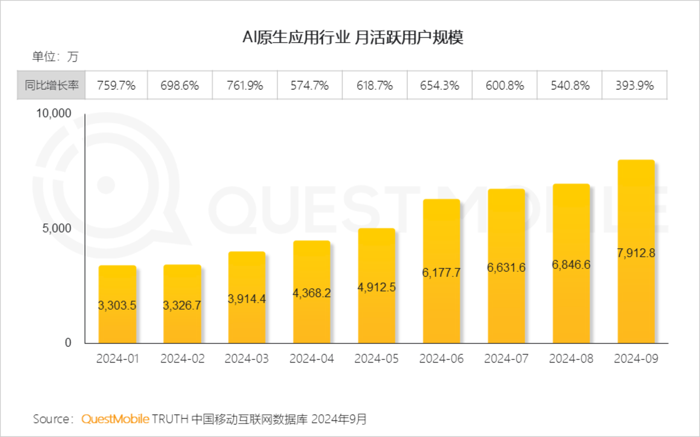 QuestMobile数据显示,2024年9月,AI原生应用行业月活跃用户规模7912.8万,同比增长达393.9%。