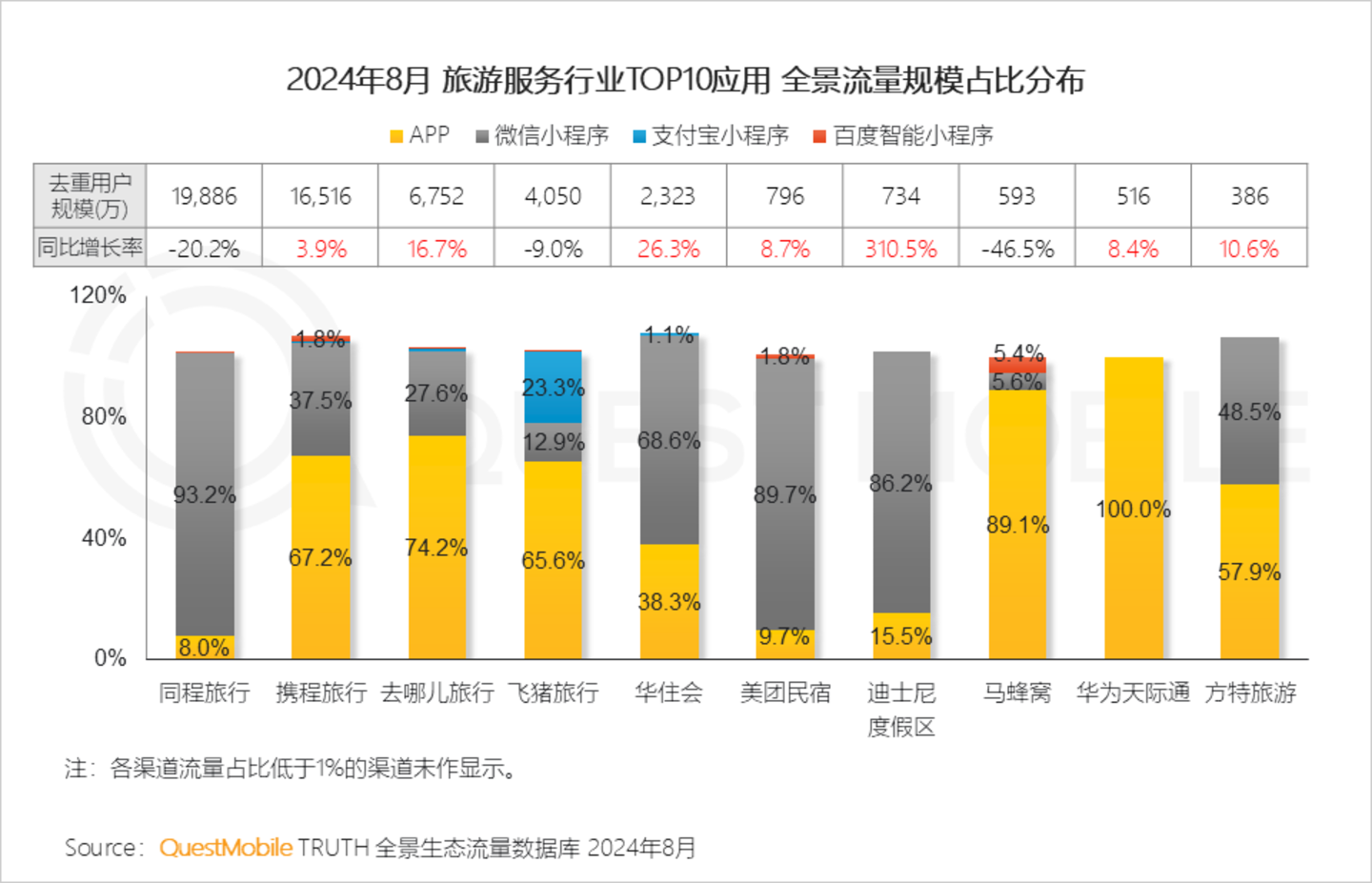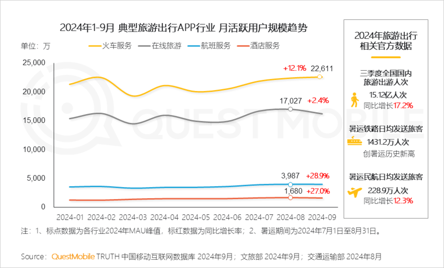 QuestMobile数据显示,2024年8月在线旅游APP行业,四线及以下城市活跃用户占比达24.5%,同比提升0.8%。