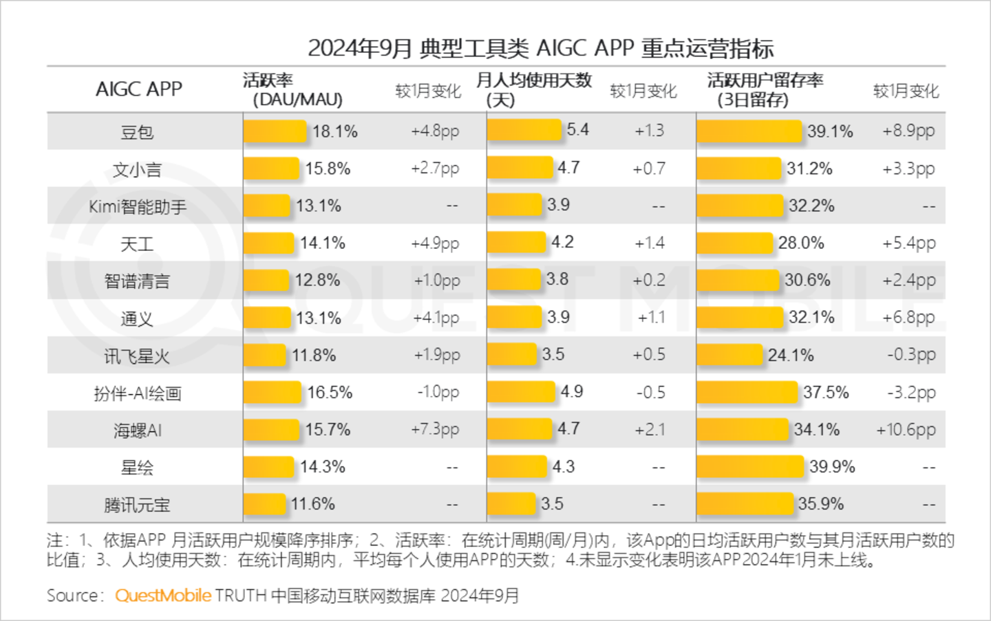 QuestMobile数据显示,2024年9月,豆包APP活跃率达18.1%,较今年1月增加4.8%;月人均使用天数5.4天,较今年1月增加1.3天;活跃用户3日留存率达39.1%,较今年1月增加8.9%。