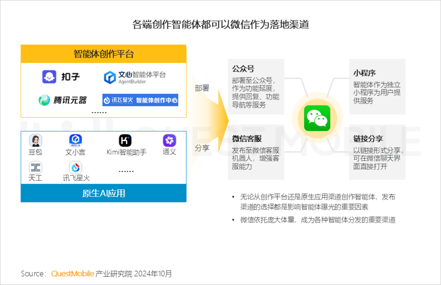 2.7 在智能体分发上,可谓谁掌握渠道,谁有资源让智能体“被看见”;除自有渠道外,微信生态似乎被认为“必选项”被统一接入部署