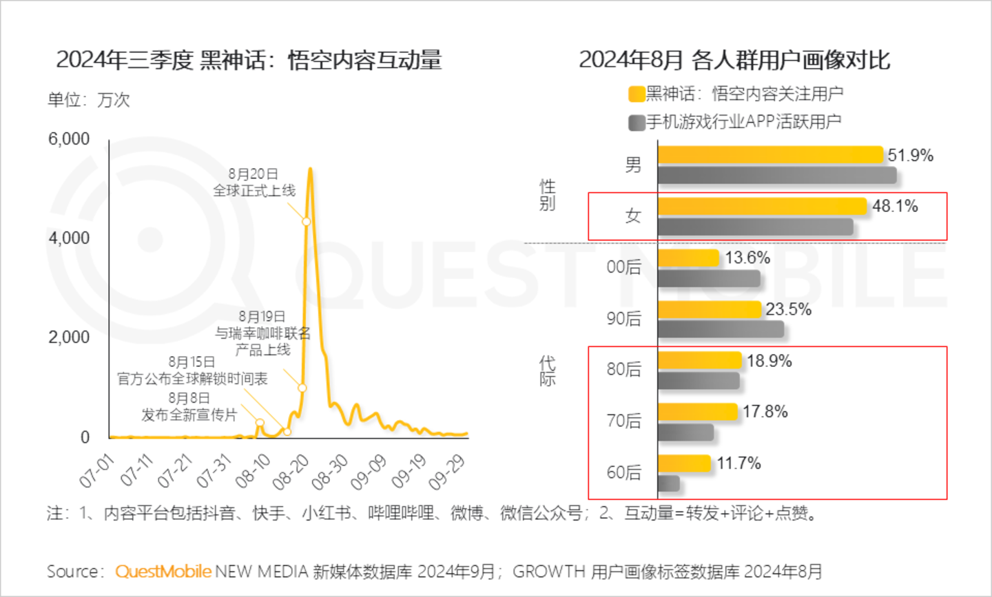 Ⅴ. 黑神话:悟空成为今年国内游戏大热门,多波宣传和营销活动助推话题流量在上线第二天达到最高峰,其关注群体相较手游用户女性、年长人群比例突出