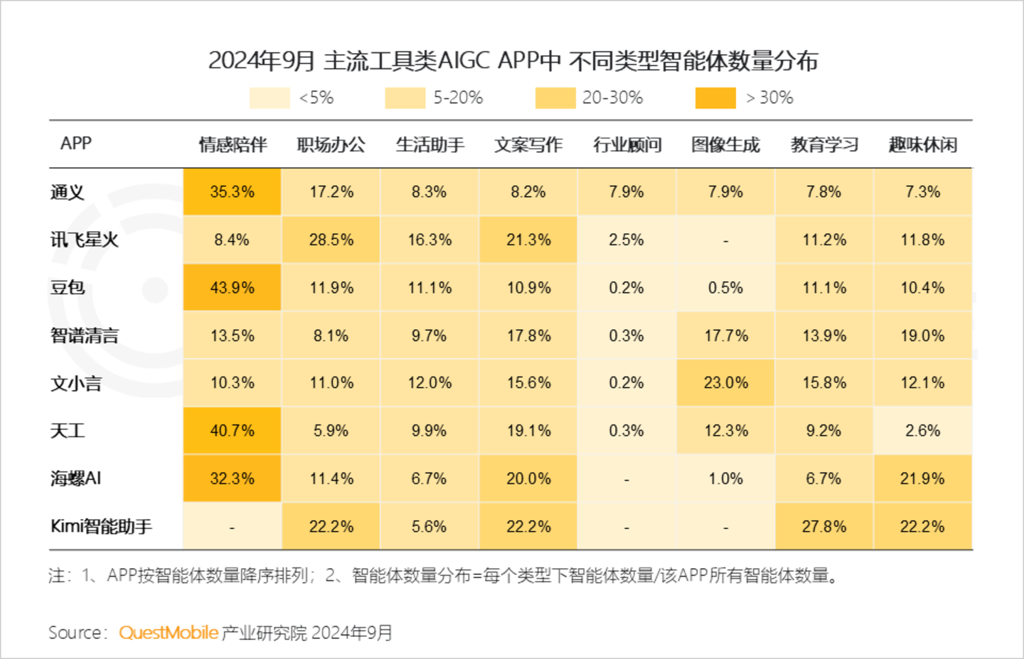 2.12 从智能体数量分布来看,情感陪伴仍为大多数AI应用首推场景;同时,职场办公、文案写作、图像生成等场景也各有侧重