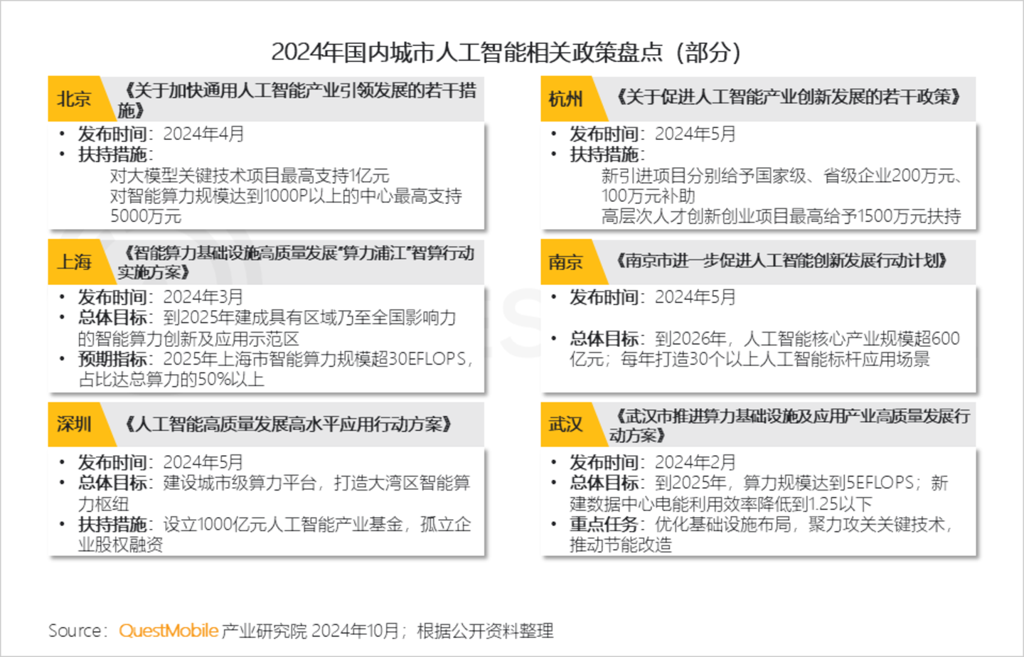 2.1 国内多城市积极出台人工智能相关政策,大力扶持产业发展;各城市期望通过政策引导和资金支持,抢占人工智能产业制高点,推动经济转型升级和高质量发展
