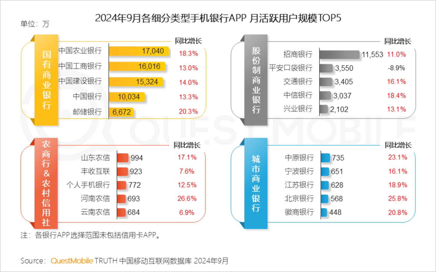 Ⅴ. 金融数字化浪潮下,TOP5国有商业银行均实现流量同比增长,其中农业银行、工商银行、建行银行、中国银行用户规模破亿;招商银行以用户规模1.16亿领跑股份制商业银行;农商行、城商行依托地方经济资源和政策,流量处于快速增长阶段