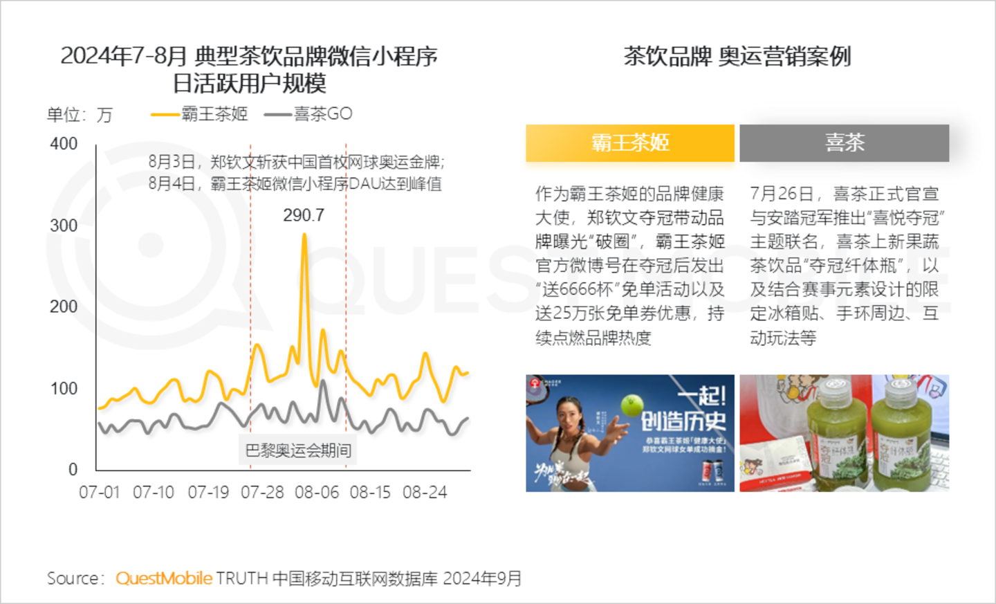霸王茶姬签约的运动员频频走上领奖台,郑钦文夺冠影响力,带动微信小程序流量大幅增长;喜茶推出奥运特别饮品“夺冠纤体瓶”销售火爆。