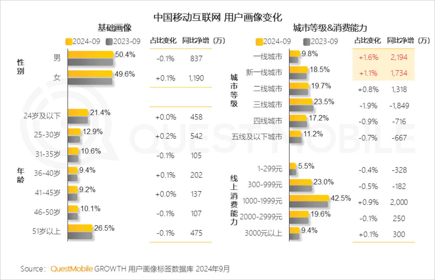 QuestMobile数据显示,2024年9月,全网用户2000元以上消费能力用户合计占比29.0%,规模合计增长550万。
