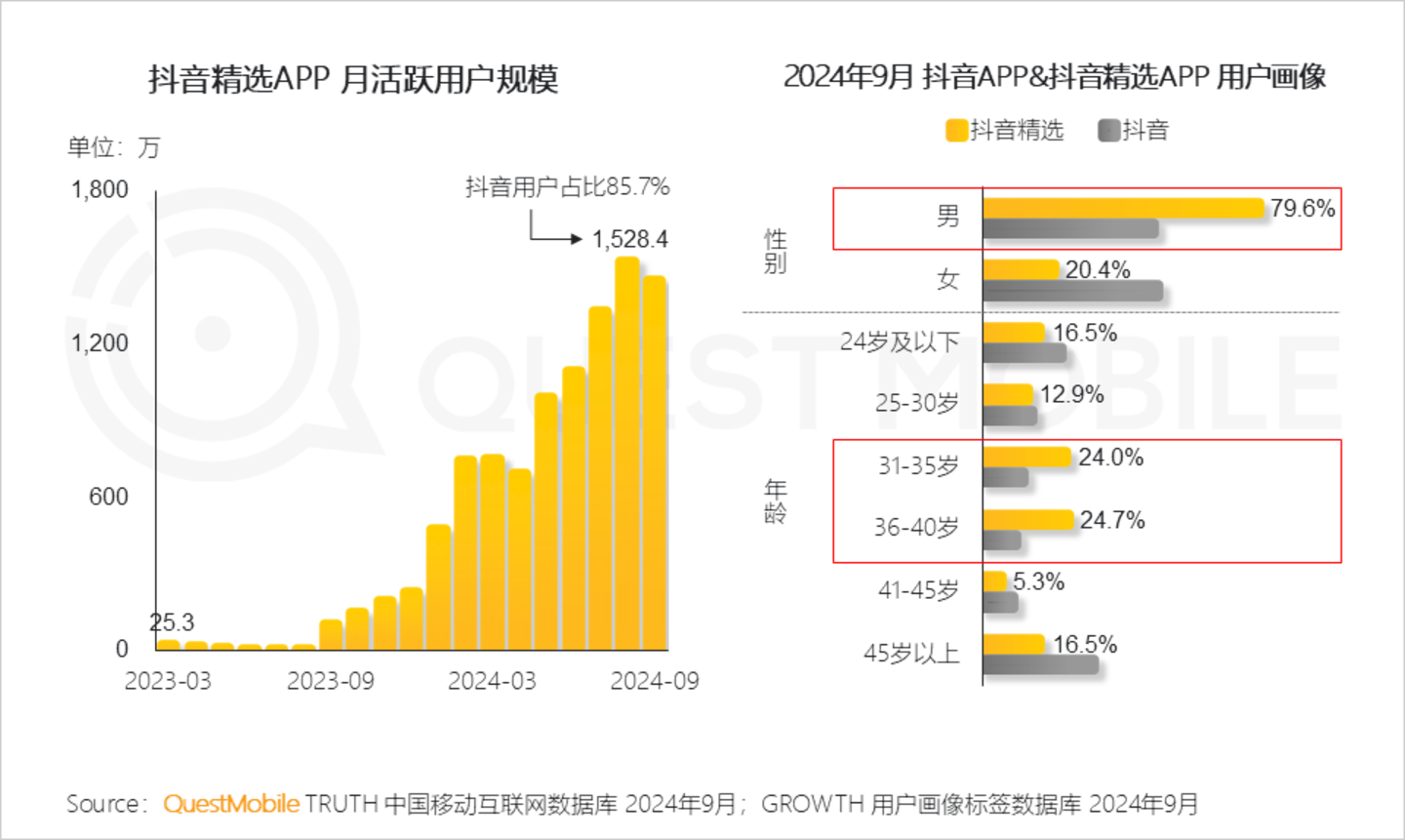 QuestMobile数据显示,抖音精选APP中85.7%为抖音APP用户,但两者用户结构差异巨大,抖音精选APP多为31-40岁男性用户群体。