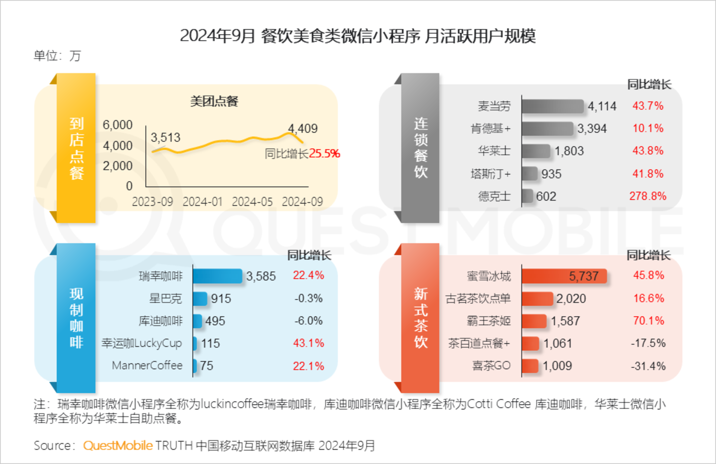 Ⅱ. 餐饮消费方面,各连锁餐饮品牌、咖啡茶饮品牌线上点单小程序用户规模均有较高增长