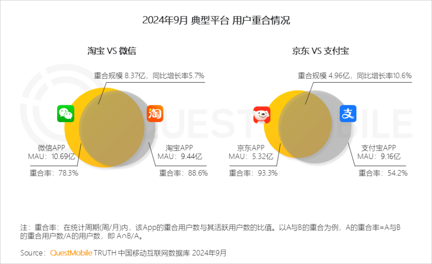 QuestMobile数据显示,2024年9月淘宝和微信重合用户规模同比增长5.7%,达8.37亿;京东和支付宝重合用户规模同比增长10.6%,达4.96亿。