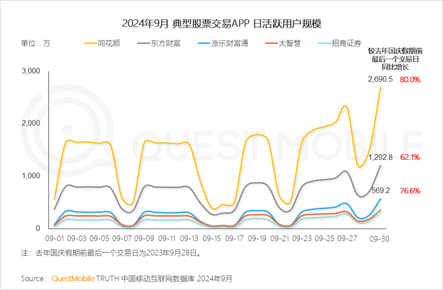 Ⅶ. 国庆假期前最后一个交易日,同花顺、东方财富、涨乐财富通等多个股票交易APP日活跃用户规模达到近期流量峰值,较去年同期涨幅显著
