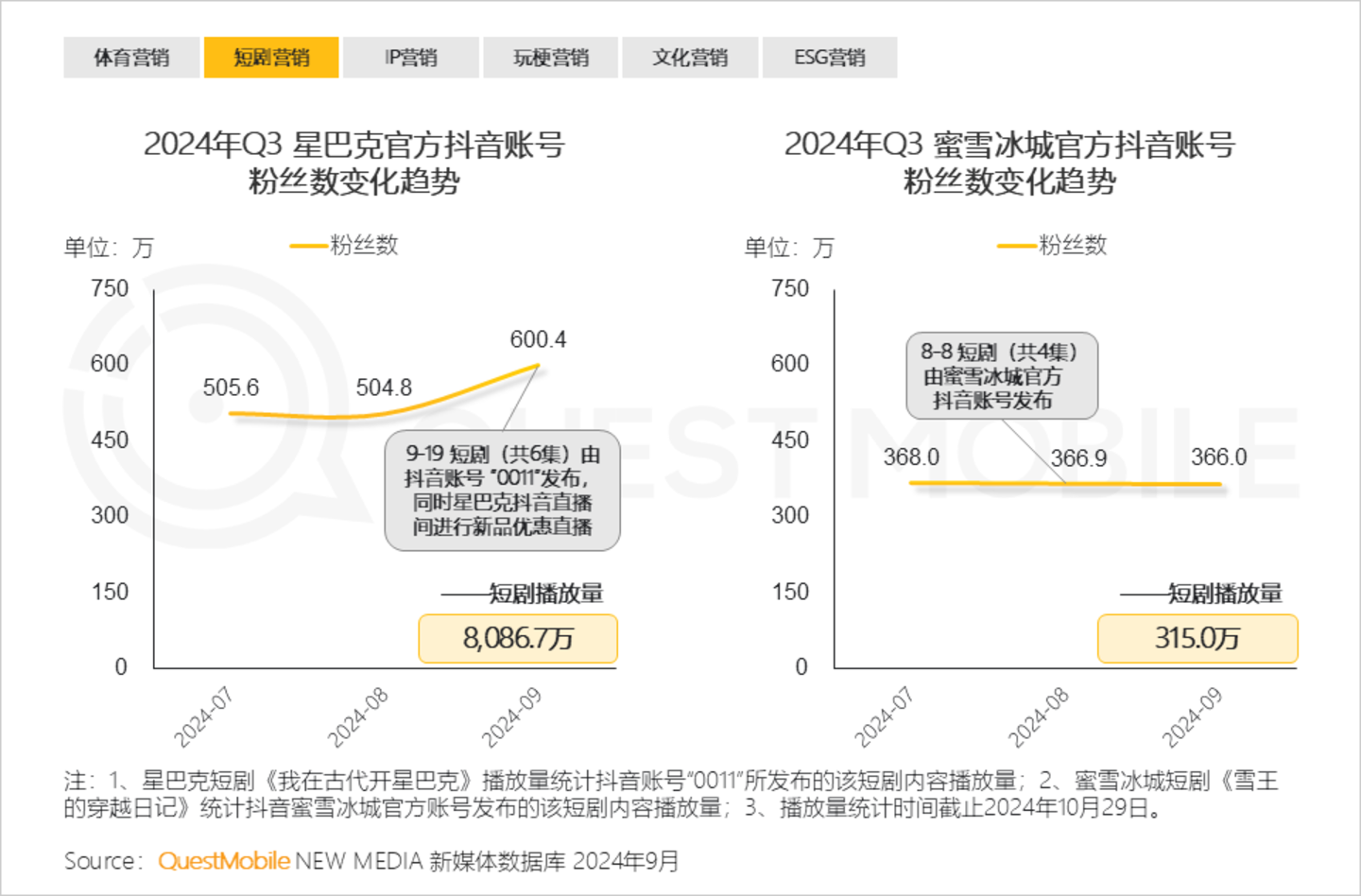 4.4 但短剧营销效果各异,星巴克通过优质短剧内容结合促销活动,实现官号流量显著提升,而蜜雪冰城短剧流量推动效果不显著