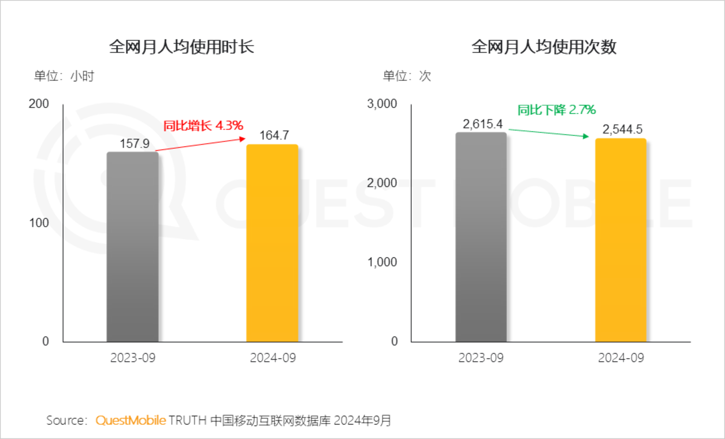 1.7 全网月人均使用时长上升,使用次数下降,或许因为内容丰富度提高,使得用户愿意花更多时间深入体验,而非频繁地浅尝辄止QuestMobile数据显示,2024年9月,全网月人均使用时长164.7小时,较去年同期增长4.3%;月人均使用次数2544.5次,同比下降2.7%。