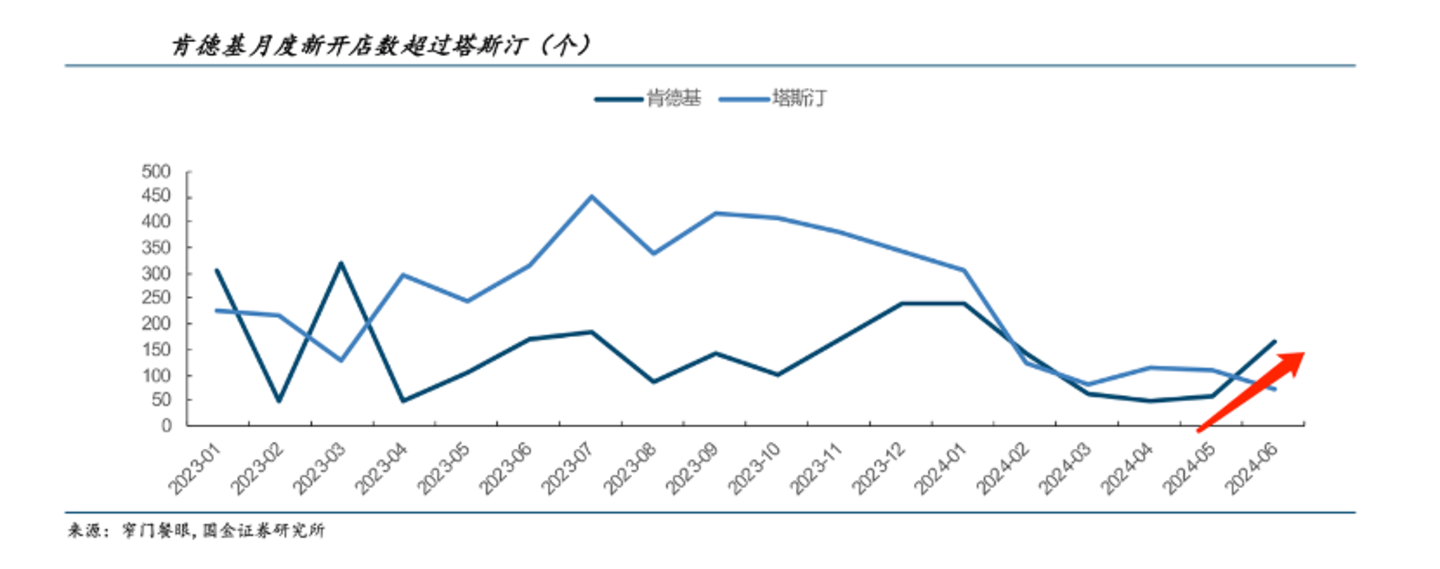 2023年之后,肯德基又遇到了新的竞争对手:塔斯汀。后者在2023 年凭借“中式饼汉堡+高性价比”产品特色出圈,通过加盟模式快速扩张,全年新开 3358 家门店,并开始从低线市场向高线市场渗透,对肯德基带来了非常大的干扰。