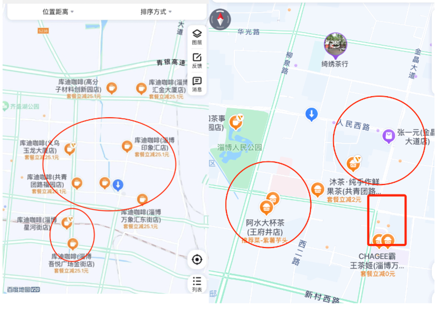 如上图所示,在淄博人民公园附近的库迪和茶饮分布情况,城市中有限的交通要道要被众多新兴门店所包围,企业为了拿到更好的门店位置就要竞相抬价,使得门店的房租成本将远超实际价值。