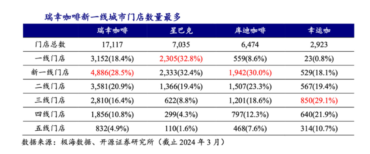 在上图中我们可以看到瑞幸和星巴克在门店分配方面更为接近(高盈利性的一线和新一线门店占比高),库迪和幸运咖的门店则更集中在三线左右城市。