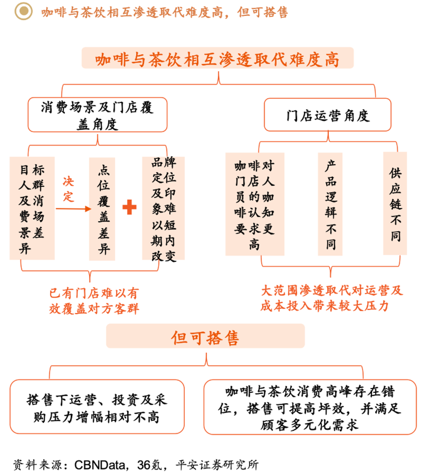 平安证券近期的报告也验证了我们的观点:咖啡和茶饮的存在销售错峰,搭售可提高坪效,满足顾客多元化需求。如今瑞幸已经出招,行业也不得不去思考经营的可持续问题。