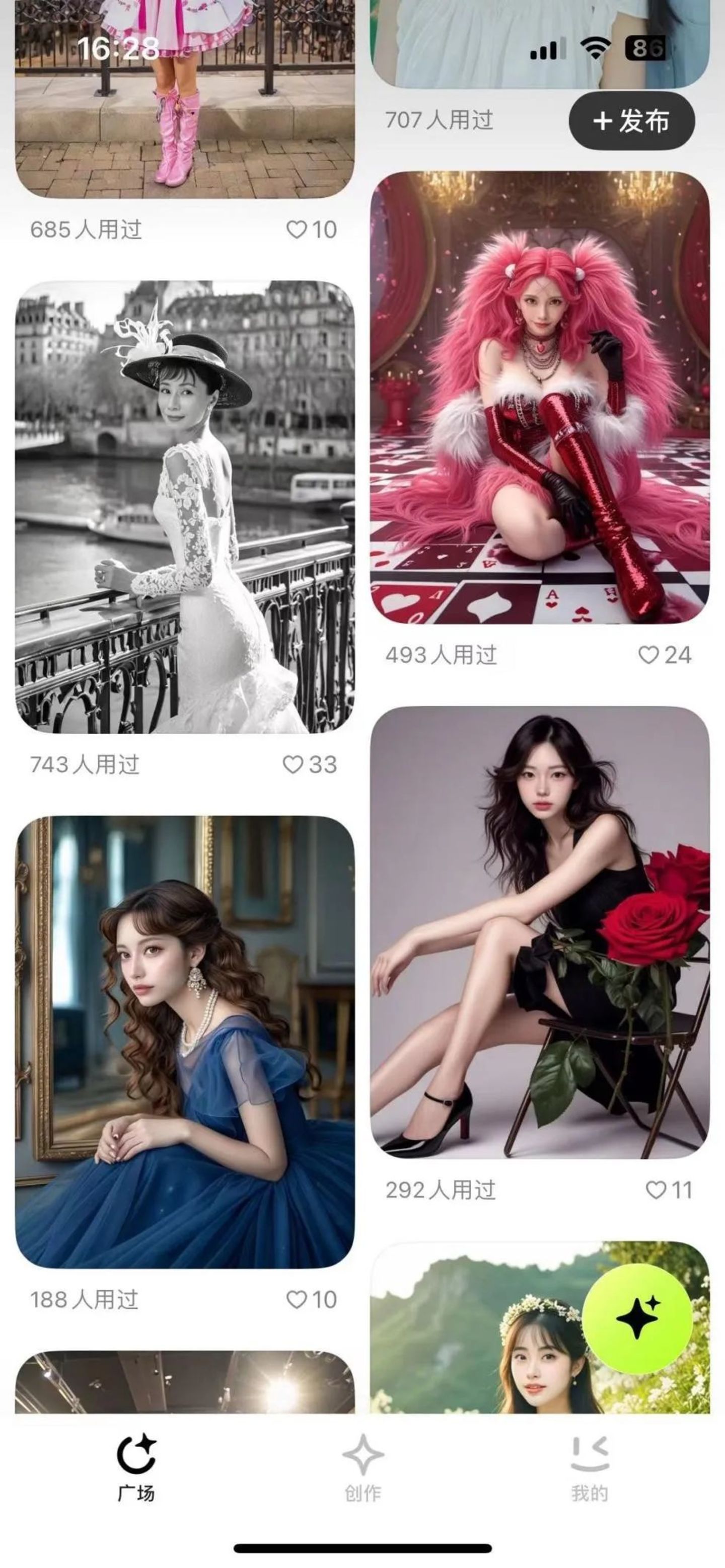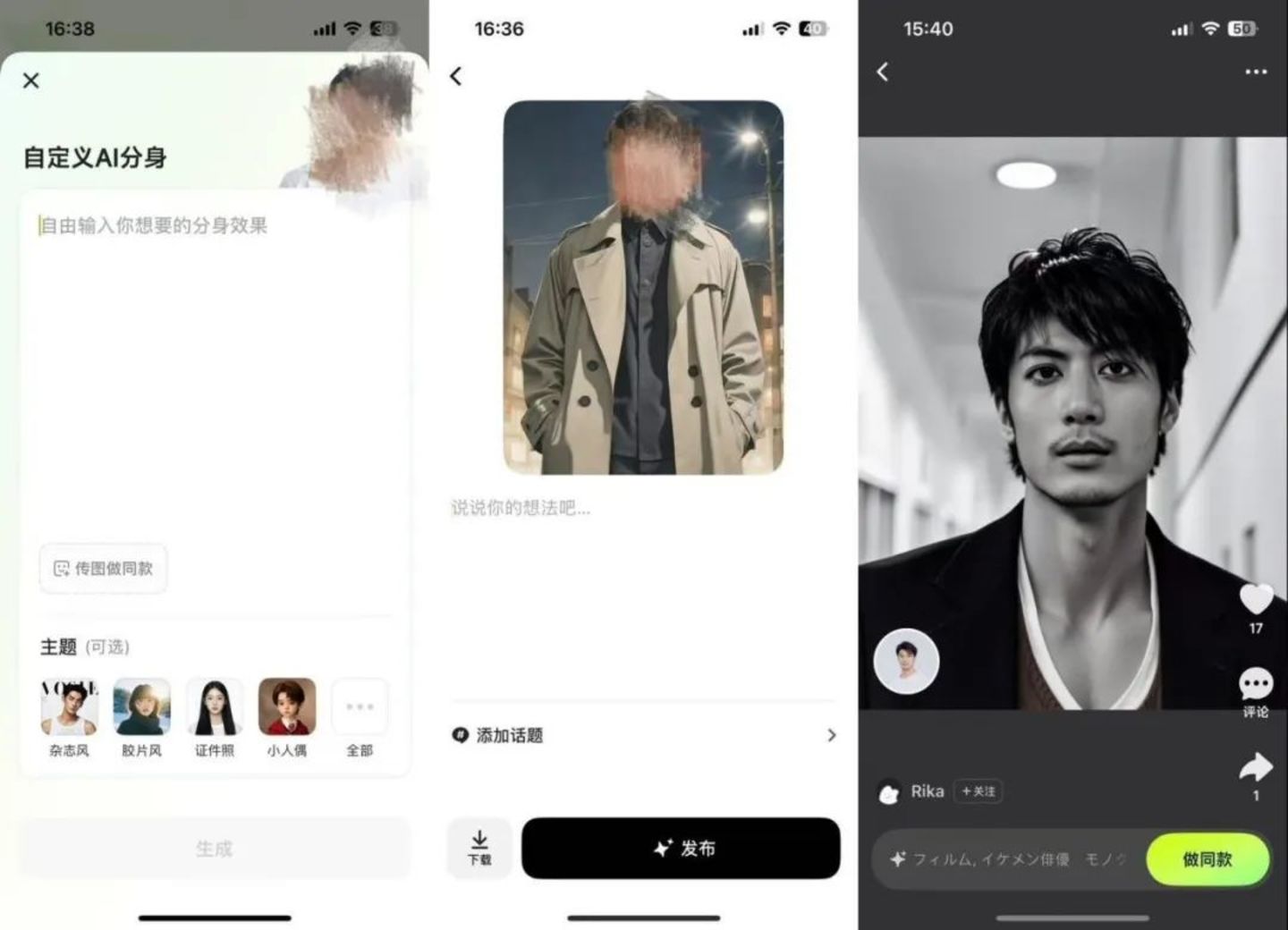 而在用户交互设计上,PicPic 突出 UGC,一定程度上满足了用户的分享欲。开始使用 PicPic 时用户会被要求上传自拍照或者现场拍照,制作出自己的“形象”,然后用户就可以输入 Prompt,开始制作 AI 写真了(如左图)。当 AI 写真完成之后,用户可以选择发布在 PicPic 之中(如中图),如果用户选择发布,其他用户就可以在 PicPic 的落地页中找到该“模版”(如右图),并通过做同款按钮,一键生成。