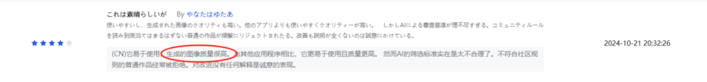 生图质量方面,笔者在测试之后个人认为是较好的。PicPic 对于面部的处理整体来说比较自然,虽然偶尔有面部失真或者手部变形的现象出现,但大多无伤大雅,抽卡成功率较高,此外,对于衣服的刻画算是 PicPic 的亮点,从笔者生成的照片来看,西装的纹理和褶皱确实呈现得比较好。从用户评论中,也同样能印证这一点,经过笔者统计,在近 90 天日本市场的 30 条用户评论中,有 9 条明确地写出了“质量高”“图片精美”等关键词,占比达 1/3。