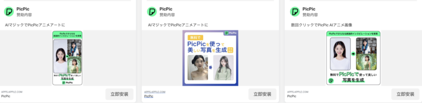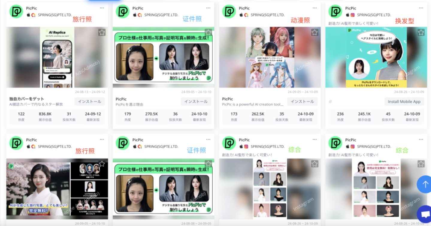 先说主题,从广告素材来看,笔者观察了近 90 天 PicPic 在日本市场展示量较高的广告后发现,这些广告素材并没有围绕着 1 到 2 个核心主题去着重曝光,而是全面铺开,将生活照、证件照、动漫风照片等等主题混在一起投放。